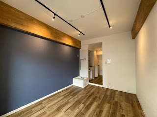 梁にアクセントクロスを使用し右側の壁は紺色のクロスで