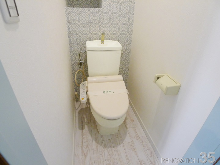 水色のさりげない柄のクロスを貼り、