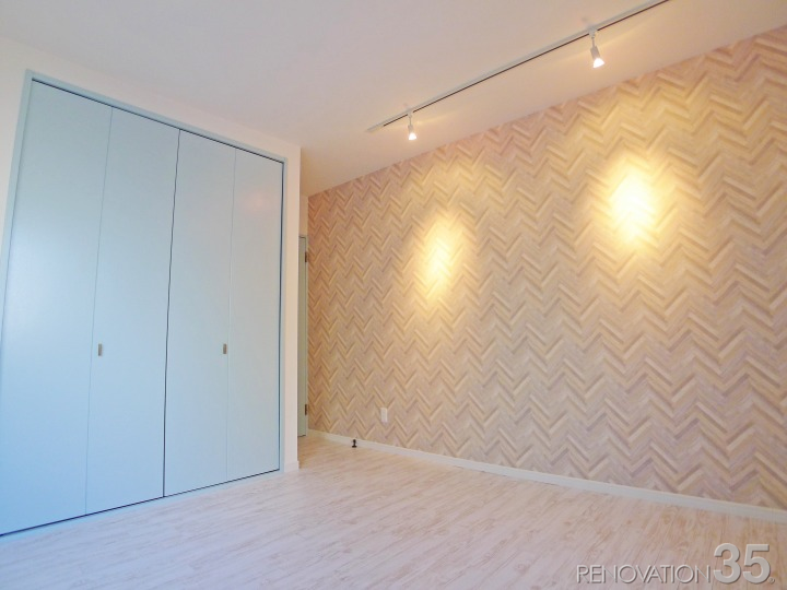 洋室の壁一面にヘリンボーン柄のデザインクロスを貼り、